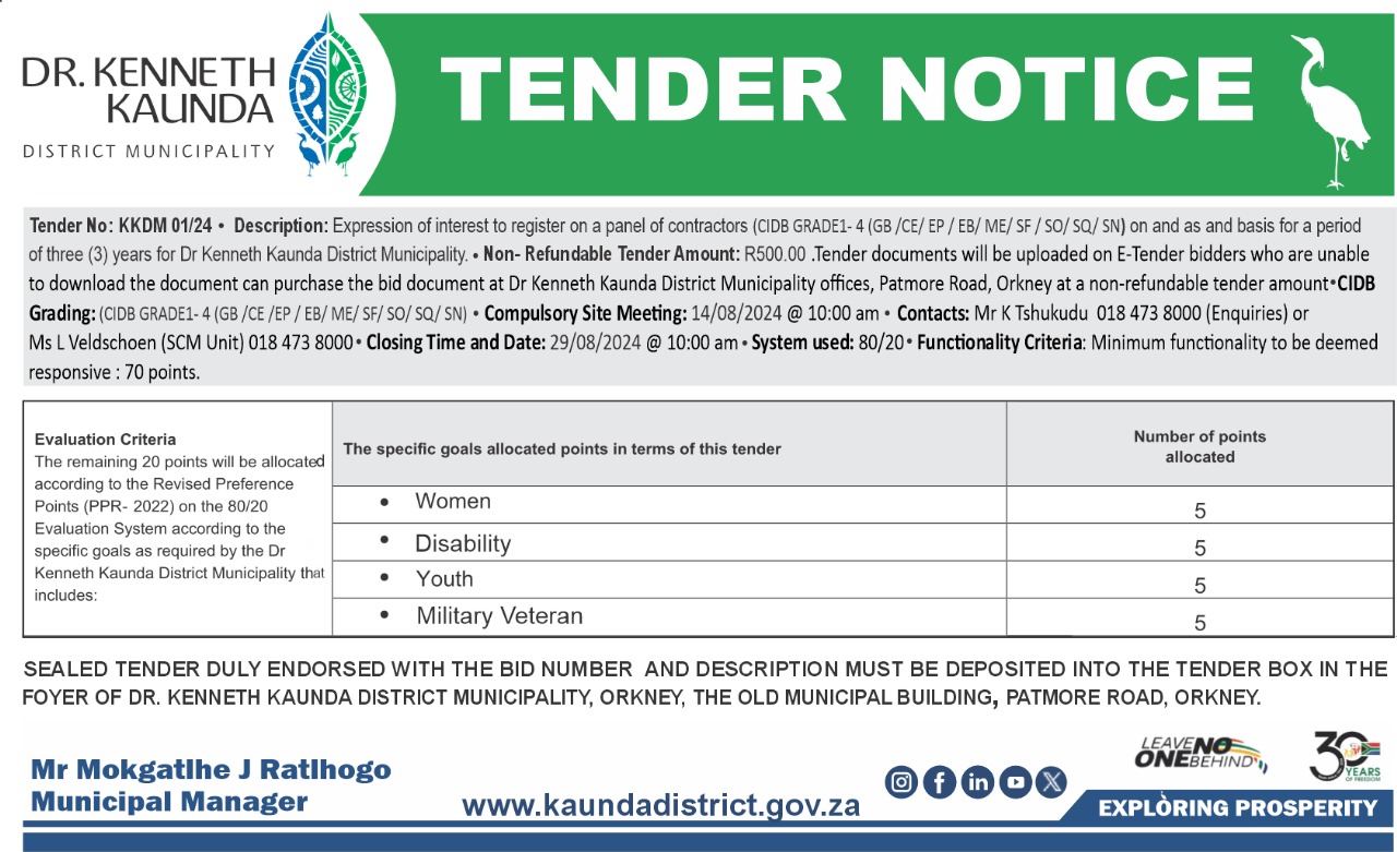R500.00 | Download Now | 28/11/2025 | View | Expression of interest to register on a panel of contractors(CIDB Grade 5 - 7 (EP/EB) on and as and when basis) for the period of three (3) years for Dr Kenneth Kaunda District Municipality. |