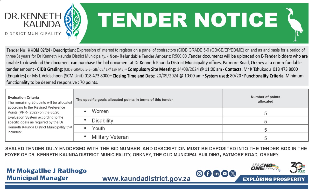 08/08/2024 | View | Expression of interest to register on a panel of contractors (CIDB GRADE 5-6 (GB/CE/EP/EB/ME) on and as and basis for a period of three(3) years for Dr Kenneth Kaunda District Municipality |