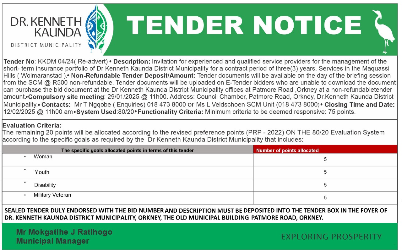 | RE-ADVERT - Invitation for experienced and qualified service providers for the management of the short-term insurance portfolio of Dr Kenneth Kaunda District Municipality for a contract period of three (3) years. |