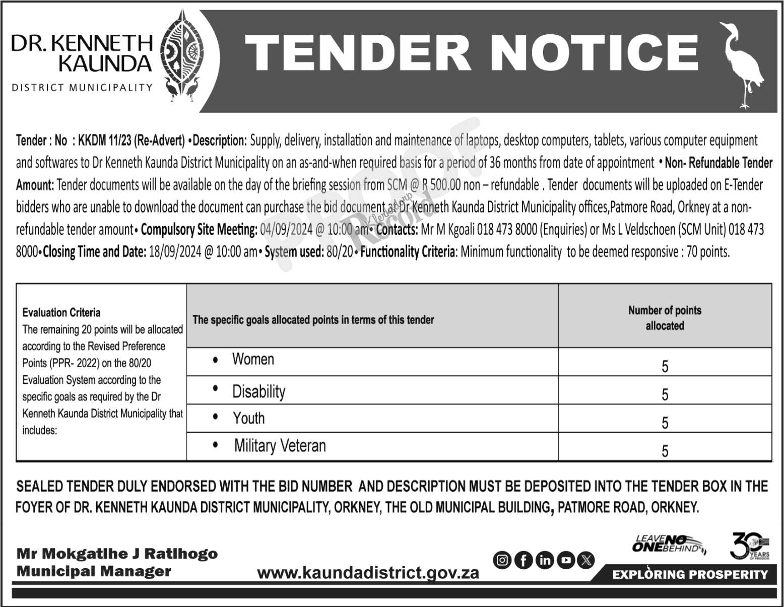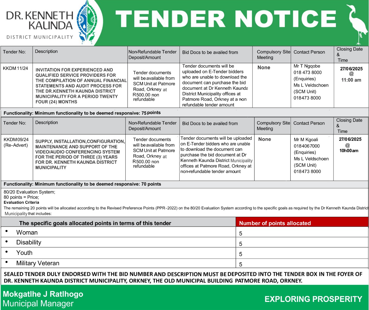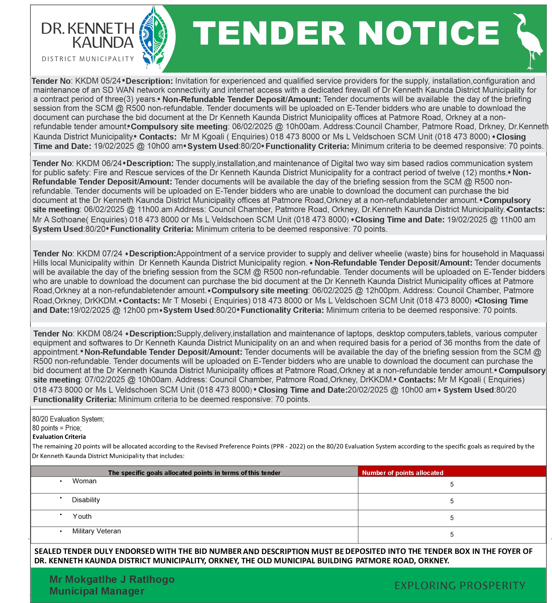 KKDM 02/24 | 20/09/2024 @ 10:00Hrs | 14/08/2024 @ 11:00Hrs | R500.00 |