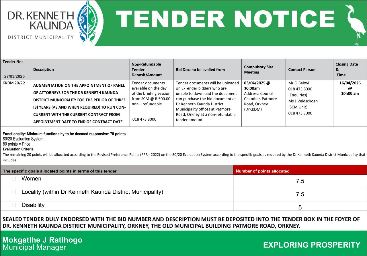 | The Dr. Kenneth Kaunda District Municipality is hereby | KKDM 24/22 | 14/06/2023 @ 10:00am | 01/06/2023 @ 10:00am @ Council Chamber Patmore Road, Orkney(DRKKDM |