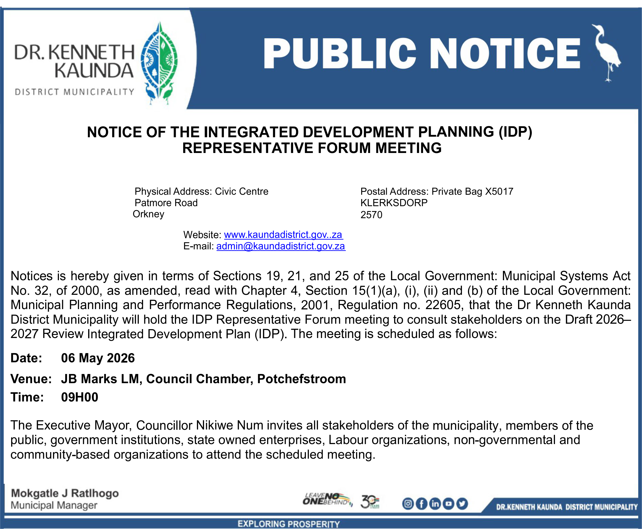 Tha the Dr Kenneth Kaunda District Municipality will hold the IDP Representative Forum meeting